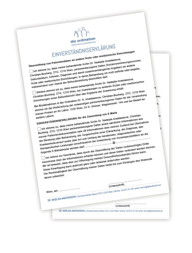 Für die sichere Kommunikation per E-Mail benötigen wir Ihre  Einwilligung sowie ein Passwort, das Sie selbst festlegen. Das Passwort wird einmalig in der Ordination unter Vorlage eines amtlichen Ausweises eingerichtet und bleibt dauerhaft gültig – also bitte gut merken! 🙂